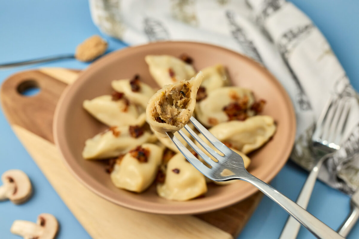 Sekretem doskonałych pierogów z kapustą i grzybami jest farsz, w którym kluczową rolę odgrywają prawdziwe, leśne grzyby. Smak borowików i podgrzybków nie ma sobie równych – nie da się ich zastąpić pieczarkami. Równie ważna jest kapusta – dbamy, by farsz nie był zbyt kwaśny, dlatego używamy zarówno kapusty kiszonej, jak i białej. Nad proporcjami tych składników długo pracowaliśmy, aż powstał przepis, który zachwyca swoim wyważeniem.