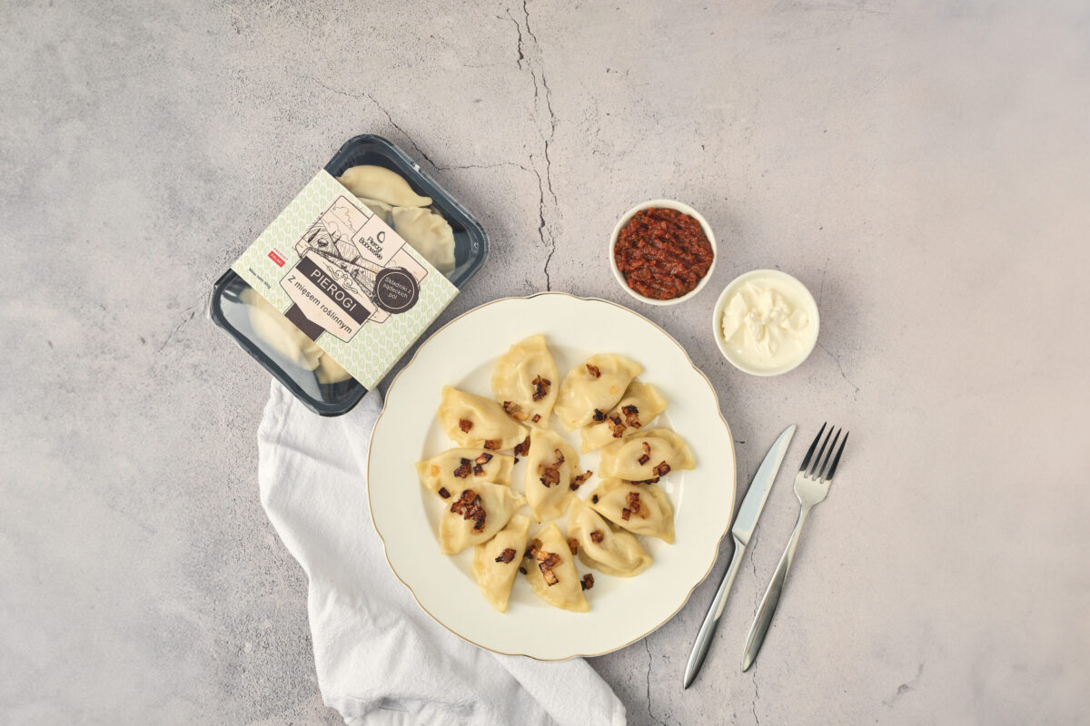 Od początku nie było wątpliwości, że przy tworzeniu receptury pierogów wegańskich poprosimy o wsparcie osoby, które specjalizują się w kuchni wegańskiej. One najlepiej wiedzą, jak osiągnąć oczekiwany przez wegan smak i dobry skład. Firma Rośliniak dostarcza nam do produkcji farszu bazę, która składa się głównie z białka grochowego, mąki grochowej i białka ziemniaczanego. Baza to istotna podstawa, ale wymaga dopracowania. My ją doprawiamy i dbamy o to, żeby nadzienie było aromatyczne i soczyste. Na koniec nadziewamy nią ciasto pierogowe, które sprawdza się u nas od lat w wielu innych rodzajach pierogów.